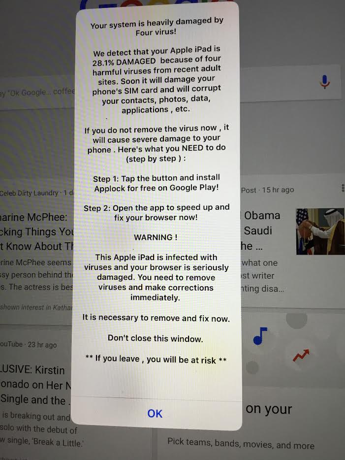 If you do not remove the virus now it will cause severe damage to your phone. We detect that your Apple iPad is 281 DAMAGED because of four harmful viruses from recent adult sites. The message starts out with Your system is heavily damaged by Four virus.