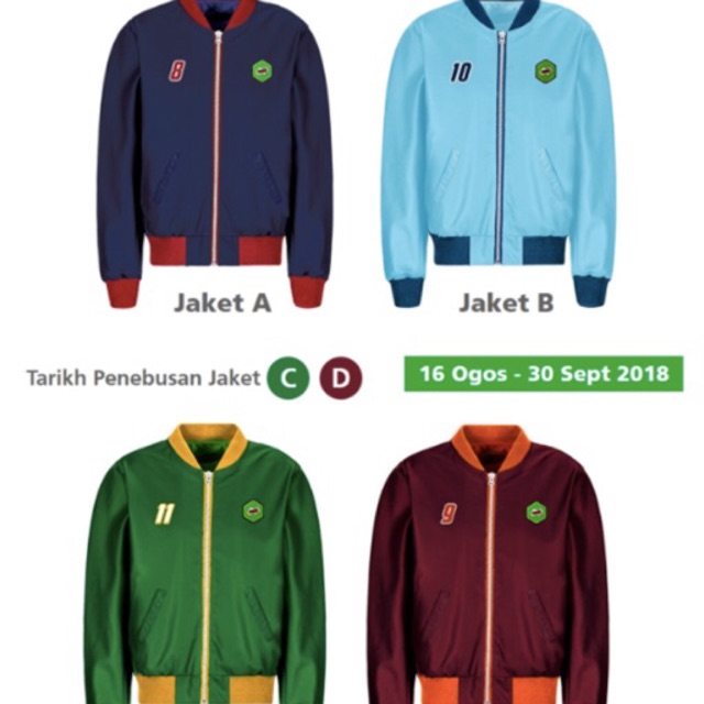 From 1st July till 15th August you can redeem dark blue and light blue colorway jacket and from 16th August till 30th September you can redeem the green and red colorway jacket.